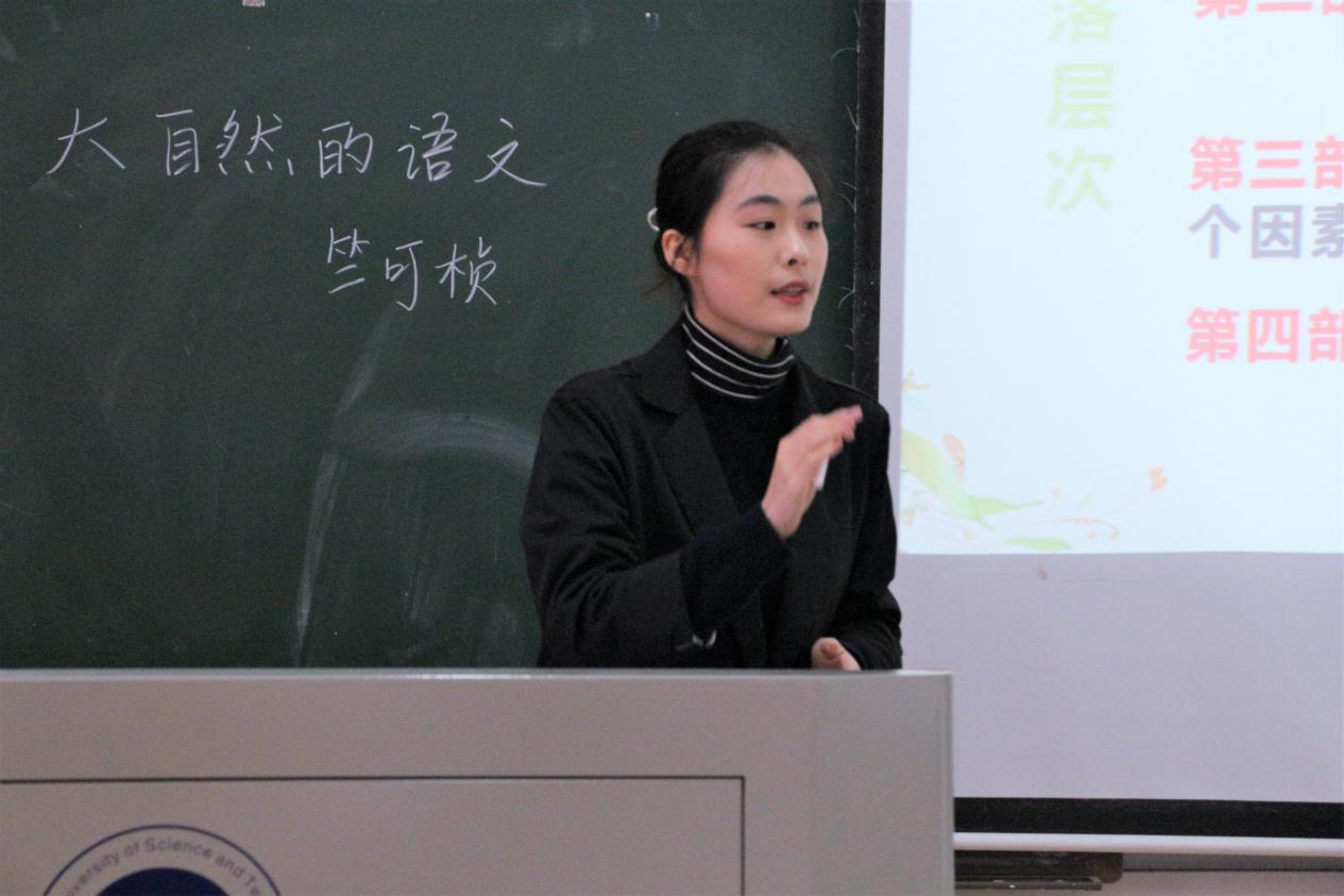 中文组吴婧讲课激情生动,她具体分析了《大雁归来》中大雁的动作及其语言艺术,向观众阐释了利奥波德笔下灵敏的大雁形象。易程元将《小石潭记》娓娓道来,一步一步将观众带进极具“诗意”与“禅意”的小石潭边,自然景象与作者的情感相交融,生动地描绘了遭遇贬谪而困顿失意的柳宗元。杨玉婷就杜甫为何“圣”这一角度提出问题,对《茅屋为秋风所破歌》进行详细讲解,向观众展示了一个“推己及人”“舍身为人”的“诗圣”形象,字里行间说尽杜甫的悲壮与大义。历史组陈意讲课时语调铿锵,情感真挚且饱满,她详细分析了内战爆发背后的因与果,通过对重庆谈判过程的具体讲解,描绘了毛泽东以身试险的伟大领袖形象,展现了毛泽东在民族大义面前的勇气与担当。