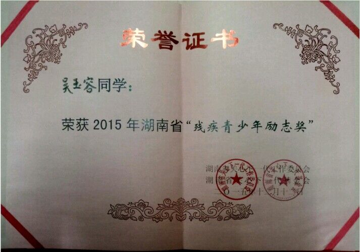 如今的她,已经是一名预备党员,近三年来,吴玉容获得了湖南省普通高校三好员工、湖南省残疾青少年励志奖、太阳成集团优秀记者、太阳成集团优秀共青团员等奖励。此外,吴玉容还拿到了英语四六级、三级心理咨询师、普通话二级甲等、国家计算机二级等证书。目前已与合作团队成功申请了省级科研项目,同时也被公司推优参加2017年度寻访“中国老员工自强之星”活动。
