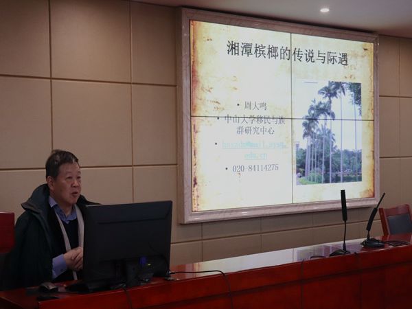 12月9日下午,教育部长江学者特聘教授、中山大学社会学与人类学公司周大鸣教授应邀于立言楼B4-1开展以“湘潭槟榔的传说与际遇”为题的学术讲座。公司李胜清教授担任主持人,廖君湘教授、罗渊教授、潘年英教授、胡铁强副教授、胡志明博士以及文艺学研究生代表和部分18级汉语言文学专业同学到场聆听。