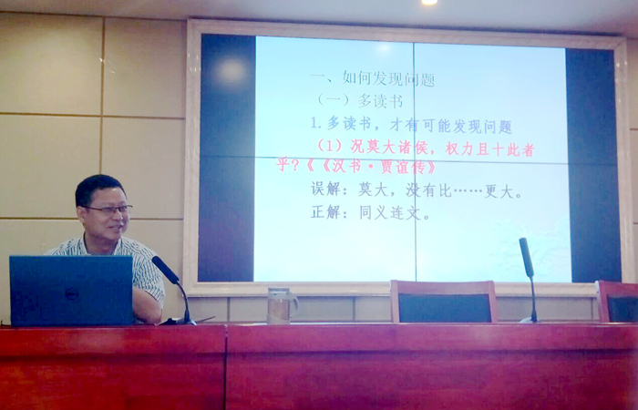 讲座伊始,叶桂郴教授解释了训诂学的含义及其意义。“训诂学与音韵学、文字学是传统小学的三大板块之一。地远有翻译,时远有训诂。训诂即以今语释古语,以通语释方言。”叶桂郴教授说道,他表示,训诂学与文学研究侧重点不同,在做语言方面的学术研究时,遇到一些细微的问题时也不能轻易跳过,而应重视问题,抓住发现问题的机遇。那么,如何发现问题呢?叶桂郴教授认为,首先应当多读书,才能发现问题,应当温故而知新。其次应多思考,思考时要多想几个为什么,并且有疑问地多思考,要留心字面简单,但意义有别的词。他列举了许多脍炙人口的古诗句中的错误解释,如“床头屋漏无干处”的“屋漏”应解释为房屋的西北角,而非房子漏水;“床前明月光”中的“床”应解释为井栏而非卧榻。除此外,还应当多动手,多查阅工具书、文献,或检索百度。就如何认识问题,叶桂郴教授认为:前人做了注解,自己也觉得正确时就按照前人说法;对前人说法有异议时或找不到前人注解时应当通过自己的研究得出较为正确的结果。叶桂郴教授在讲座中也分享了他认为训诂学研究时应注意的原则:勿平实,忌好奇;重证据,忌臆测;宁阙疑,勿强解。叶桂彬教授援引《搜神记》、《文选》、《说文》等大量文献中的实例,说明当今广泛存在的对古文错解的现象,他强调这些现象应当通过人文学者的努力得到纠正。